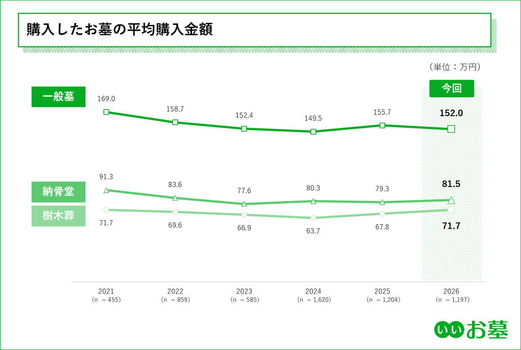 平均購入金額に関しては、一般墓が152.0万円と前年(155.7万円)より減少したものの、依然として150万円を超える高い水準にあります。一方で、納骨堂は81.5万円、樹木葬は71.7万円となっており、一般墓の約半分の予算で用意できる選択肢として定着しています。中でも樹木葬は、かつての50万~60万円台から上昇傾向にあり、需要の拡大とともに「個別区画」や「デザイン」にこだわった高付加価値なプランが選ばれるようになり、購入単価が底上げされている可能性が考えられます。