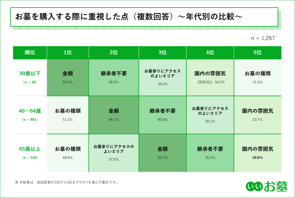 39歳以下の若年層においては、全体平均で2位だった「金額(55.3%)」が1位となり、次いで「継承者不要(39.5%)」が2位にランクインするなど、予算面と将来の管理負担の有無を最優先に判断する、現実的な傾向が顕著です。