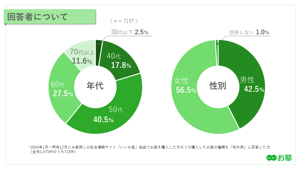 - 調査対象:2024年1月~同年12月にお墓に関するポータルサイト「いいお墓」経由でお墓を購入した方のうち購入したお墓の種類を「樹木葬」と回答した方