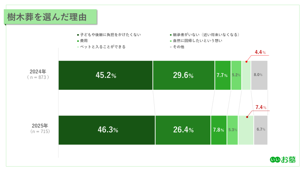 「継承者がいない」は前回の29.6%から微減し、代わりに「ペットと入ることができる」が4.4%から7.4%へ増加しています。樹木葬を選ぶ理由として、継承の課題だけでなく、ペットと一緒に眠りたいという新しいニーズの存在感が増していることがうかがえます。
