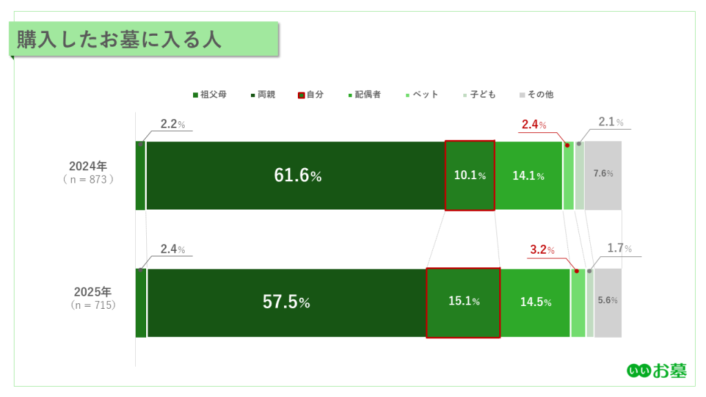 一方で、「自分」は10.1%から15.1%へ、「ペット」は2.4%から3.2%へ増加しており、生前に自分のお墓を準備する人が増えているほか、ペットと一緒に眠るという選択肢が広がりつつあることが読み取れます。