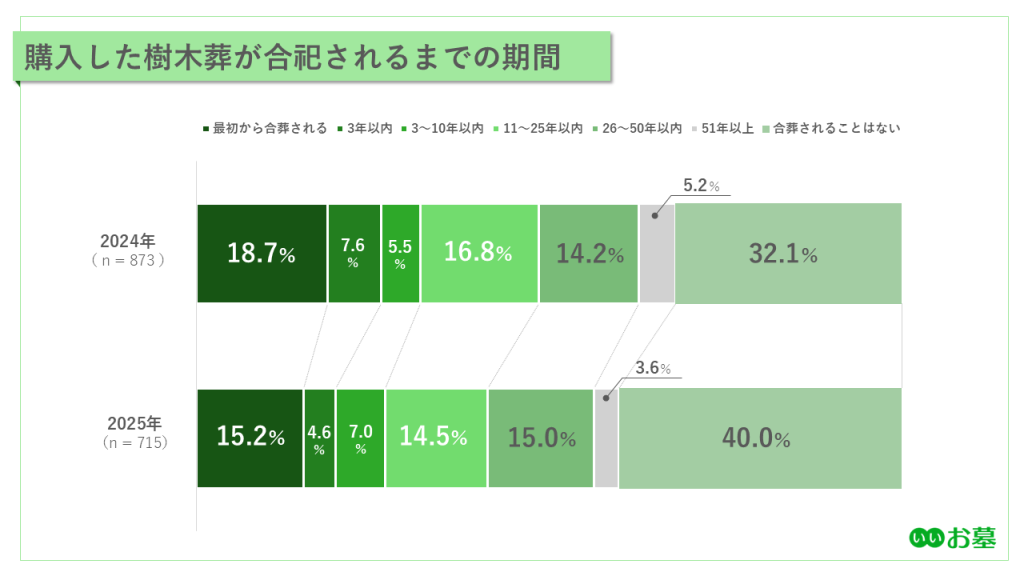 また、「最初から合祀される」と回答した方は、18.7%から15.2%へ減少しました。この結果から、樹木葬の購入者の間で「できるだけ長く個別で供養したい」という意向が高まりつつあると考えられます。