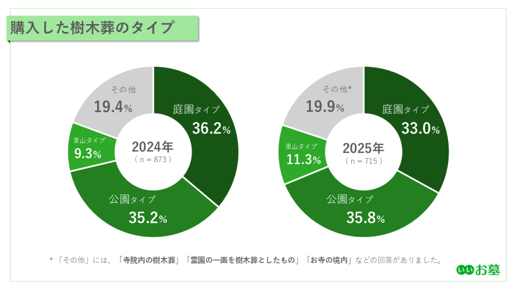 「購入した樹木葬のタイプ」は、前回同様、「公園タイプ」35.8%「庭園タイプ」33.0%が中心で、全体の約7割を占めました。一方で、自然に近い環境での埋葬を希望する「里山タイプ」は9.3%から11.3%へ増加し、自然志向や環境への配慮といった価値観の広がりにより、里山型を選ぶ人が着実に増えていることが示唆されています。