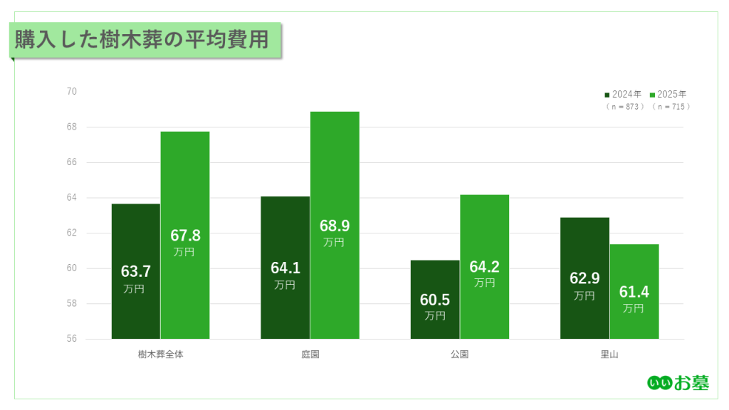 「樹木葬のタイプ別の平均金額」は、庭園タイプが68.9万円(前回64.1万円)、公園タイプが64.2万円(前回60.5万円)といずれも上昇しました。一方で、里山タイプは61.4万円(前回62.9万円)とわずかに低下しています。樹木葬全体の平均費用は63.7万円から67.8万円へと上昇しており、前回比で約4万円の伸びが見られました。